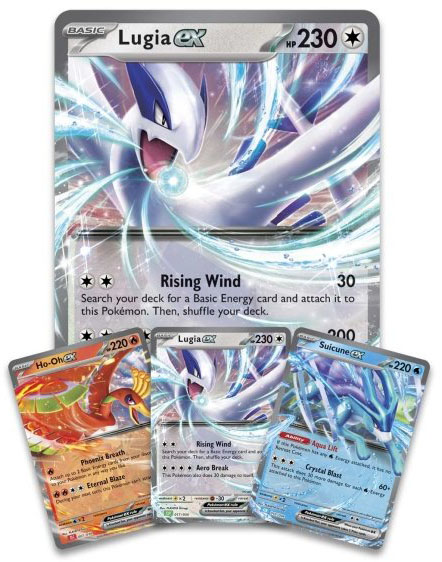 Drie legendarische Pokémon ex uit de Johto-regio combineren hun krachten in deze spannende collectie! Zweef boven de regenboog met Ho-Oh ex, duik diep onder de golven met Lugia ex en ren over het water met Suicune ex. Je krijgt ook een foliekaart met Mr. Mime, een extra grote kaart met Lugia ex, een drietal Pokémon Tool-kaarten en een handvol boosterpakketten om je verzameling uit te breiden!